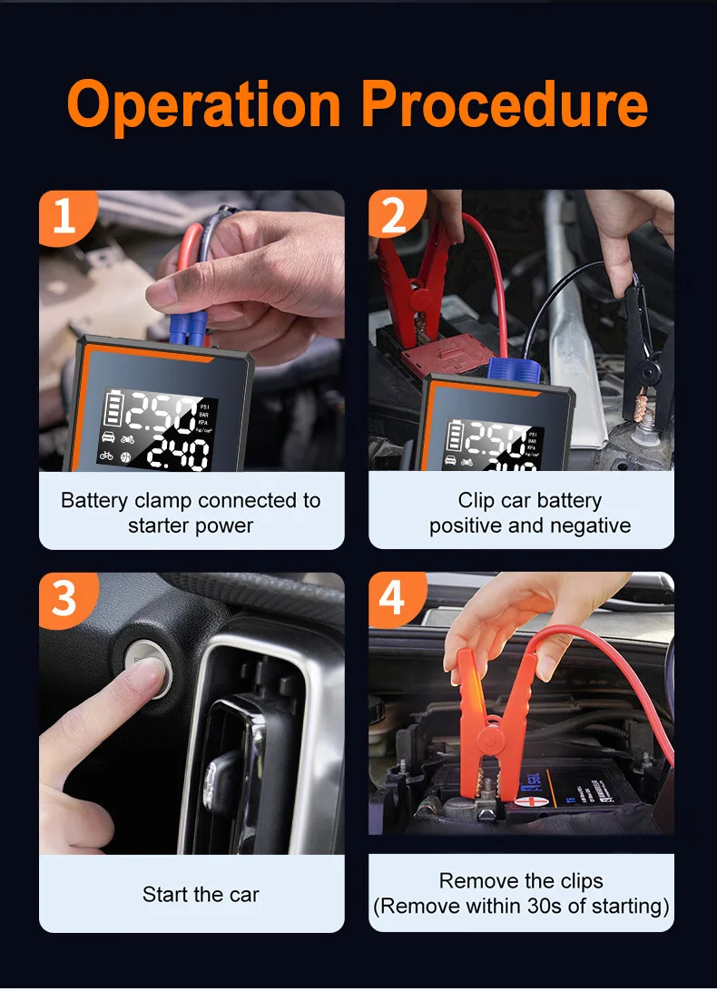 Retire las abrazaderas de la batería del automóvil dentro de los 30 segundos posteriores al arranque.