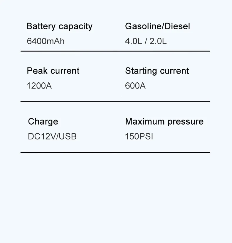 Capacidad de arranque del motor: Gasolina hasta 4,0 L / Diésel hasta 2,0 L