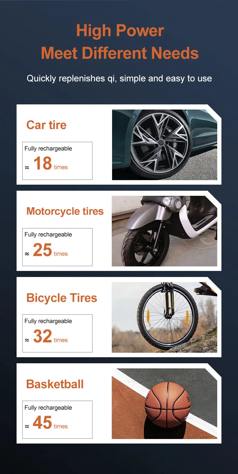 Compresor de aire de alta presión: Infla neumáticos con precisión y facilidad. Preajusta la presión de los neumáticos con un solo toque y se apaga automáticamente al alcanzar la presión deseada. Presión máxima: 150 PSI.