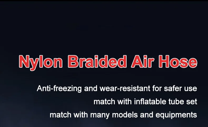 • Equipado con una  manguera de aire trenzada de nailon  que es  anticongelante, resistente al desgaste y funciona a la perfección con varios juegos de tubos inflables y modelos de equipos.